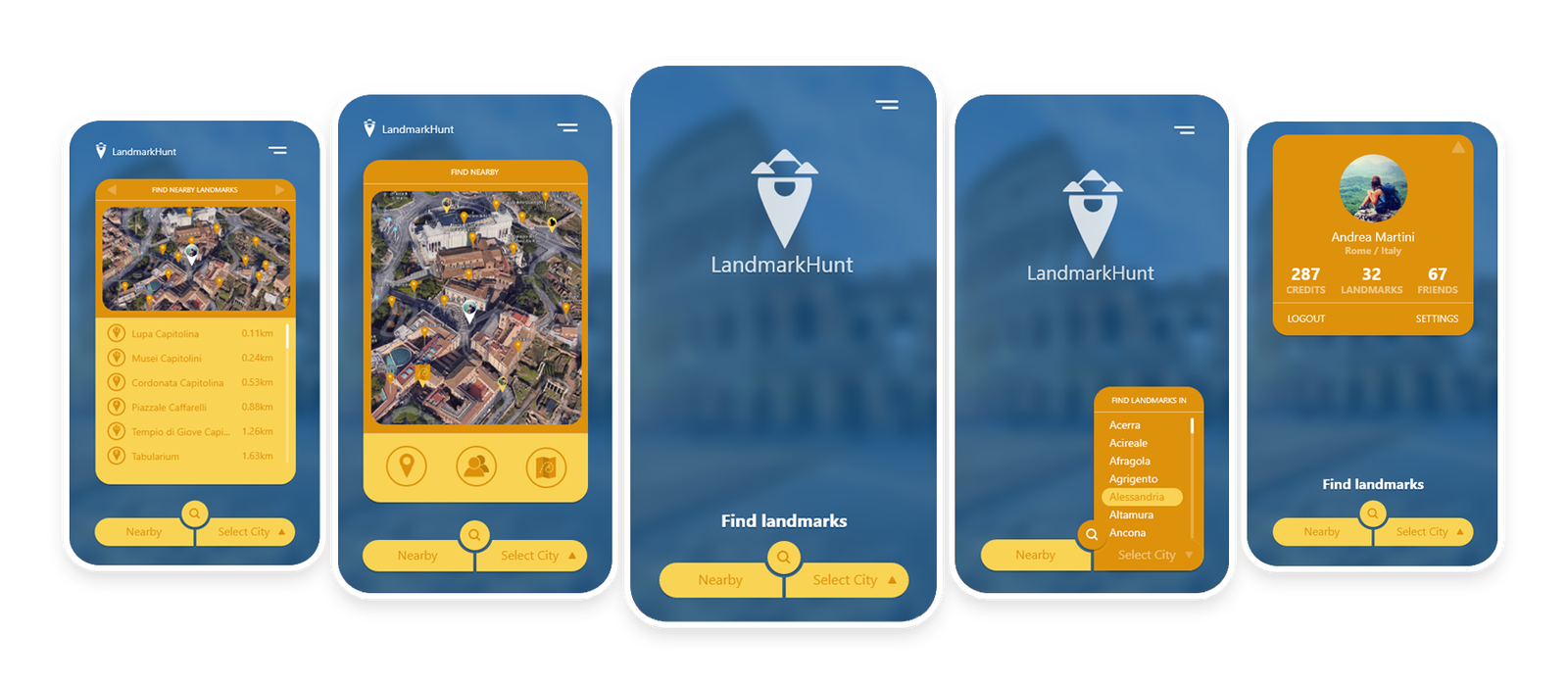 The LandmarkHunt is an imagined mobile app dedicated to people that want to discover interesting landmarks in the cities that they visit.